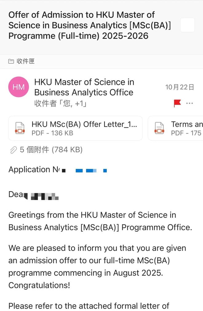 8 月中旬,朱老师通知我港大开放了商业分析硕士提前批,立刻帮我收集信息、提交申请。10 月初,我就收到了港大的提前批 offer!这意味着我的申请季几乎 “提前结束”,拿到了最满意的结果 —— 这是 6 个月前焦虑的我完全不敢想的。